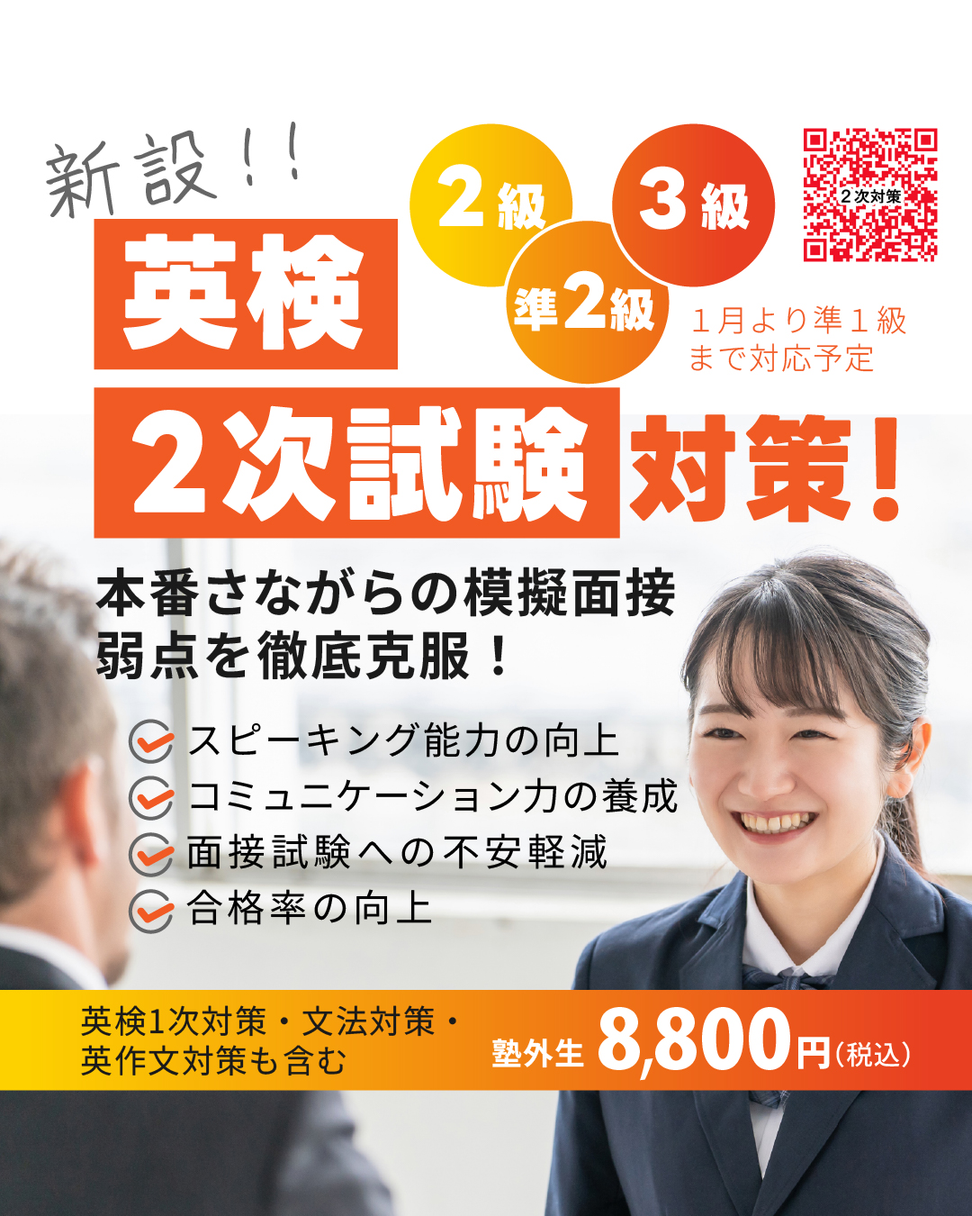 【新設】英検2次試験対策! 新設!!英検2次試験対策! 本番さながらの模擬面接! 弱点を徹底克服! 3~2級まで対応!(1月より準1級まで対応予定) ★英検2次対策の重要性 スピーキング能力の向上 コミュニケーション力の養成 面接試験への不安軽減 合格率の向上 8,800円(税込)でご利用が可能です(塾外生) 英検1次対策・文法対策・英作文対策も含む 英検2次試験対策に申込む お申し込みは右QRコードをお読みいただくか クリックしてお申し込みいただけます。